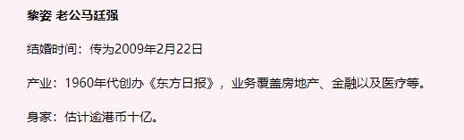 2008年,黎姿宣布退出娱乐圈。之后,她嫁给了商人马廷强。据媒体报道,其老公的身家约10亿港币。婚后,黎姿自然成了豪门阔太。