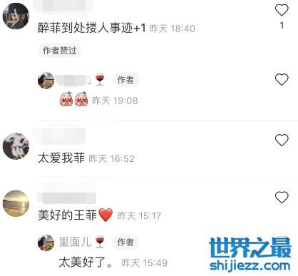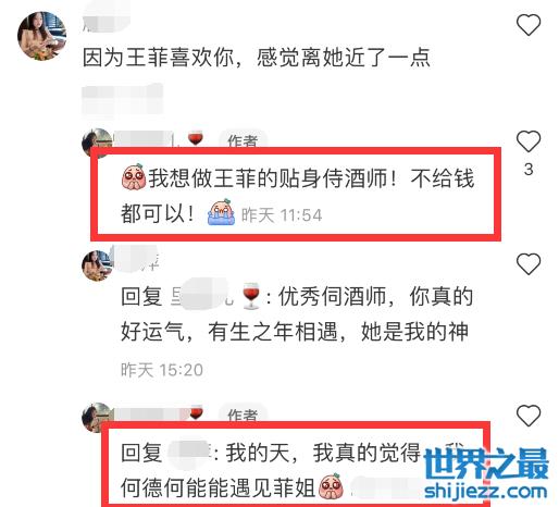 网友评论王菲是“醉菲到处搂人事迹+1”,侍酒师描述王菲“太美好了”,“王菲本人特别香”,“是最美好的回忆”。