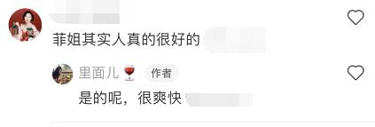 该网友描述道:“饭桌上的菲姐显得格外亲切,不管是经纪人还是朋友,她都不允许别人叫她姐,她说:我就是菲,咱们平辈,谁也不比谁厉害,叫我菲就好。而且,她只喝勃艮第,别的地的酒一律不喝,作品一号都一滴不沾,果然是我的偶像!品位都一模一样”