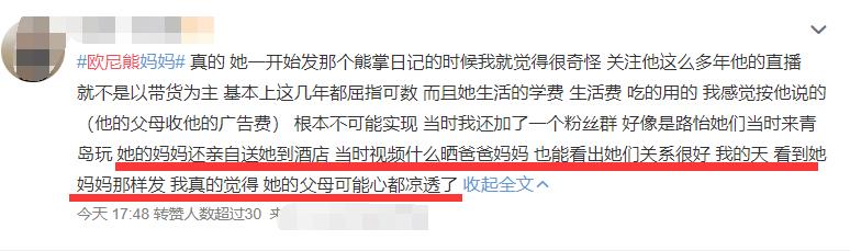 欧尼熊多年的粉丝都有发声,称欧尼熊之前一直说家境好,父母很疼爱自己,和陌生男人谈个恋爱,就去伤害自己的父母,真是恋爱脑。