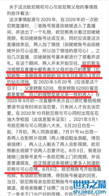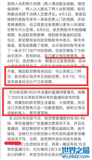 欧尼熊和可心恋爱后,遭到父母的反对,欧尼熊就反口说被父母压榨辱骂,并跟粉丝控诉父母的行为。作为欧尼熊2020年的直播间管理员(房管)称自己看到的欧尼熊,家庭生活富裕,父母疼爱,与可心恋爱后,欧尼熊反口称这一切都是假的。