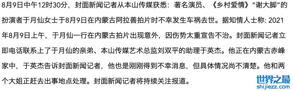随后有官方媒体也证实了此次的消息,并表示于月仙的工作人员以及家人已经赶到了当地处理后续事宜。
