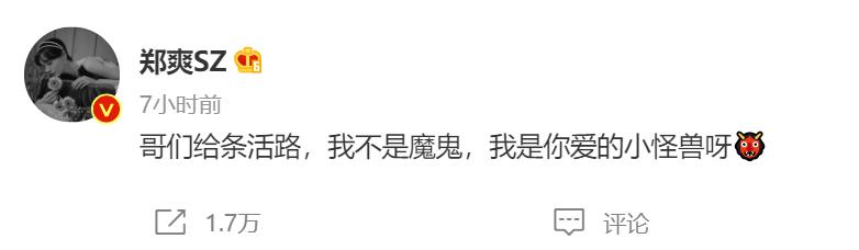 等到灾情和奥运会的热度过去了,她又在凌晨突然发博:哥们给条活路,我不是魔鬼,我是你爱的小怪兽呀。许多网友都一头雾水,郑爽这是在求饶?