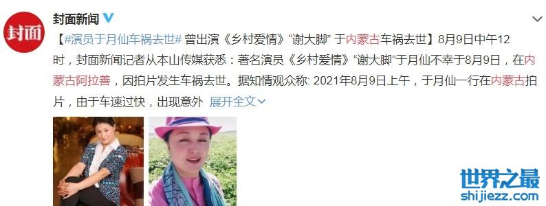而各大媒体也纷纷放出消息,昔日演员“谢大脚”于月仙不幸在8月9日,于内蒙古阿拉善因拍片发生车祸去世。而确定放出此消息的正是于月仙的亲弟弟,还有本山传媒艺术总监刘双平的助理于英杰。