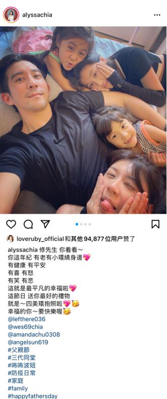 8月8日,贾静雯在个人网络社交平台上晒出全家福,与三个女儿一起为老公修杰楷庆祝父亲节,除了她与修杰楷所生的两个女儿外,与前夫孙志浩所生的大女儿梧桐妹也在场为继父庆祝,两人的父女关系看起来十分和谐。