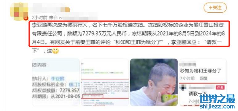 虽然李亚鹏并未在意这些言论,但其近来也正值多事之秋。就在昨天,有媒体爆料李亚鹏再次成为了被执行人。他旗下相关产业被冻结的权益数额高达7279.35万元,被冻结期限从2021年8月5日到2024年8月4日。