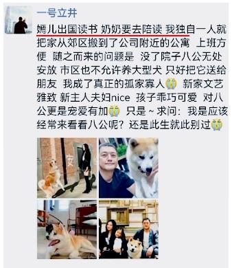 根据李亚鹏所说,李嫣由于出国读书,奶奶要陪同前往,由此,自己把家搬到了离公司更近的地方。这样一来,八公没有办法再自己养,只能另寻主人。