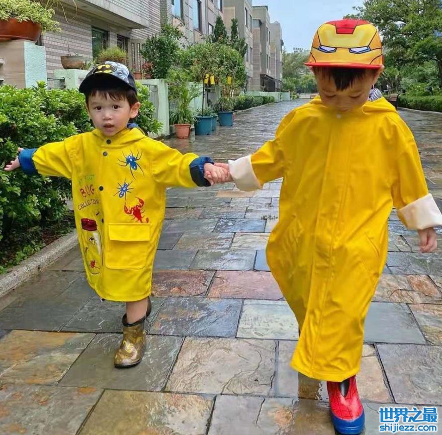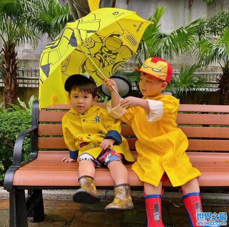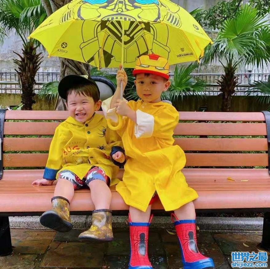 照片中,胡杏儿的两个儿子坐在公园的长椅上,两人都穿着黄色雨衣,脚上踩着雨靴,大儿子李奕霆面对镜头咧着嘴角微笑,看起来有些害羞,双手撑着伞为弟弟打伞,打着打着伞全部偏在弟弟一侧,自己淋着雨。