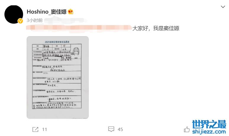 有网友发现,在窦佳嫄的报名表中,她耿直地写道自己参加选秀节目是为了增加曝光度,拥有更多的工作机会和挣钱养家,引起网友热议。还有她像小学生一样的字迹也是十分吸睛。