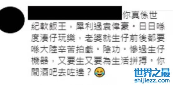 “你真是世纪软饭王,每天就知道和孩子玩,胡杏儿就连生孩子前后都要去大陆拍戏,比生育机器还惨。”