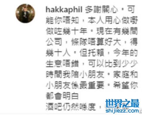 “本人用心做事做了几十年。现在有几家公司,今年的生意不错,可以有时间陪小朋友,家庭和小朋友是最重要的,希望你都会明白。”