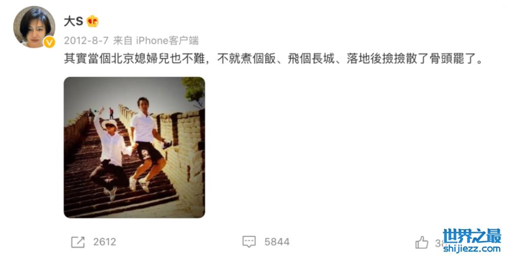 当年,汪小菲和大S闪婚后,最初,两人大多数时间是定居在北京的。刚开始,大s对北京的生活还算满意,喜欢在微博以“北京媳妇”自居。