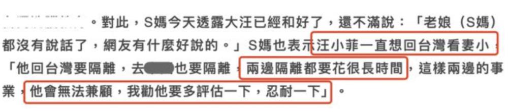 徐妈还在采访中透露了不少细节,她称汪小菲最近想去台湾看大s和小孩,但却被徐妈拒绝了。徐妈称两边隔离都要花时间,而且这样一来,汪小菲两边的事情都无法兼顾。