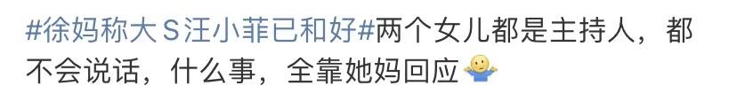 网友们看到徐妈回应大s和汪小菲已经和好的事情,第一反应都是吐槽,称徐妈这是要出道的节奏,有网友直言:“两个女儿都是主持人,都不会说话,什么事,全靠她妈回应。”也不怪网友吐槽,这徐妈都成了大小s的发言人了。