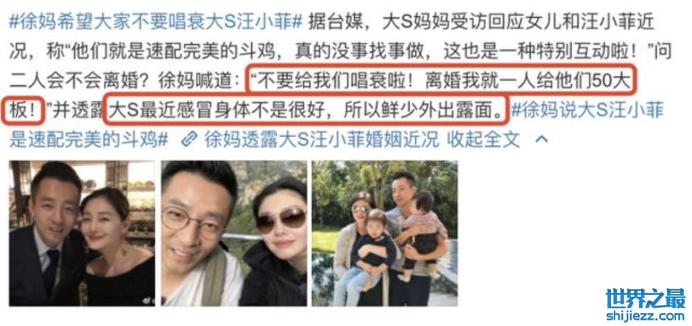 近日,大s的妈妈徐妈在接受媒体采访时表示,大s和汪小菲现在已经和好。徐妈还让大家不要唱衰大s和汪小菲,直言:“不要给我唱衰啦!离婚我就一人给他们50大板。”