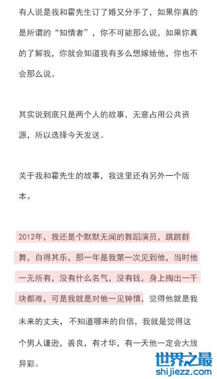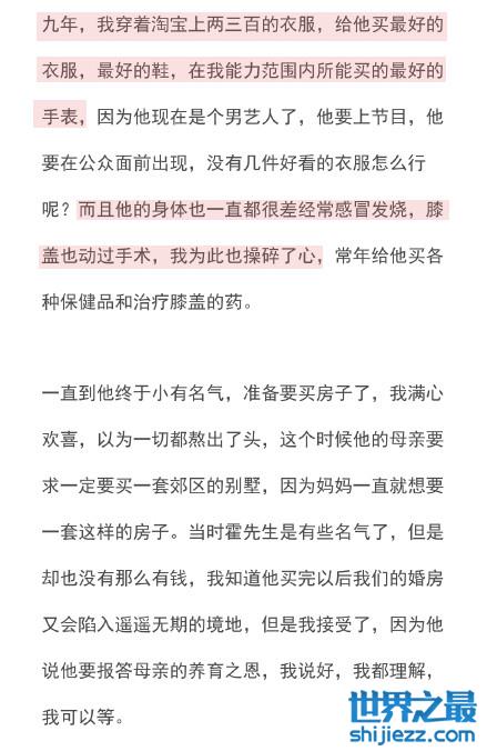 从长文中得知,陈露是一名舞蹈演员,第一次见到霍尊时就对他一见钟情,当时还是舞蹈演员的她为了赚更多的钱从而放弃了自己的大好前途,也是为了让霍尊的压力小一些,轻松一些。而在一起的前五年两人的感情还很稳定,像普通的情侣一样约会、牵手、接吻,很美好。