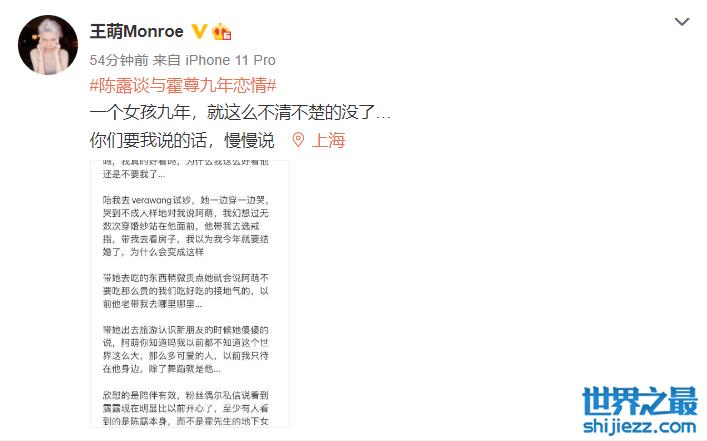 陈露闺蜜王萌也有发文回应陈露和霍尊九年的恋情:“一个女孩九年,就这么不清不楚的没了…你们要我说的话,慢慢说”。