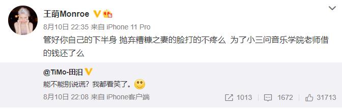 除了火风外,其好友田汨也发文力挺霍尊,他讽刺陈露说谎话,请大家稍安勿躁,自有分晓,只不过这番力挺却遭到了陈露朋友的回怼,反击他管好自己,抛弃糟糠之妻的脸打的不疼么?为了小三问音乐学院老师借的钱还了么?