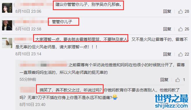 火风能够如此迅速作出回应,也是因为在事情发酵后,不少网友聚集到他的评论区对其网络暴力,有网友直言让火风出来管管儿子,还有网友认为养不教父之过,将责任怪到火风身上,更过分者喊话不要让霍尊学吴亦凡那套,评论区已被不少网友攻陷。