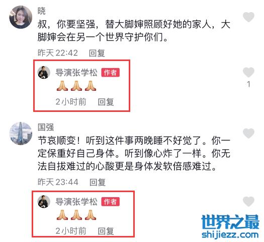 在张学松的视频中,置顶的视频是他为妻子拍摄庆祝祖国繁荣的动态,是今年六月份拍摄的,而在这条视频的评论区,有网友发现已经深夜很晚了张学松还没有入睡,竟然翻牌了不少网友。有网友说看了他的账号好像知道了这就是爱情,请他节哀,还有网友希望张学松替大脚好好照顾其家人,大脚婶会在另一个世界守护,还有网友让张学松注意身体,节哀顺变,面对网友们的关心,张学松回复了祈祷的表情,这些网友们的关心他都看到了,内心应该安慰一些吧。