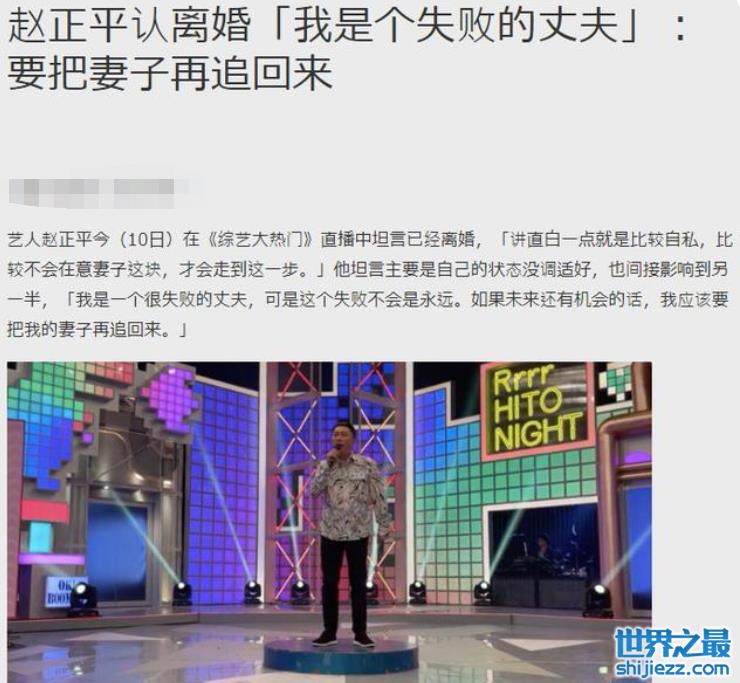 据悉,赵正平是在参与某综艺的录制时,突然宣布自己离婚的,并讲到6年前结婚时自己很开心,但是如今离婚了,很是不知所措,最重要的是不明白自己做错了什么妻子要和自己离婚。