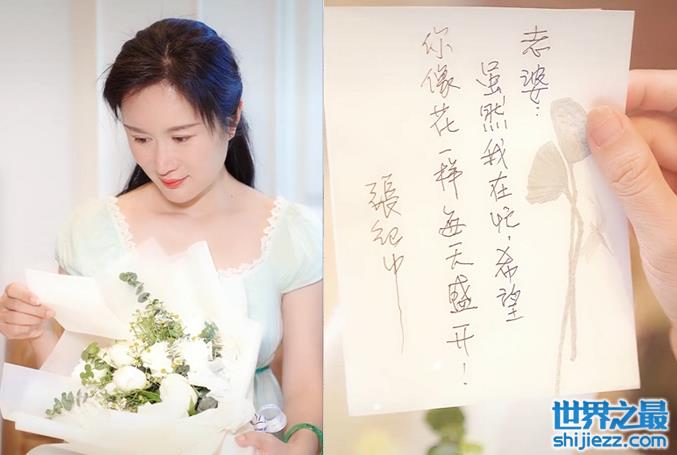 还有近日,张纪中特意为妻子贴心的准备了一束花,画面中妻子穿着淡青色长裙,拿到花时一颦一笑皆是优雅高贵。花里还有一张张纪中贴心准备的小纸条,告诉妻子自己工作去了,并表示希望妻子每天都美得像花一样。