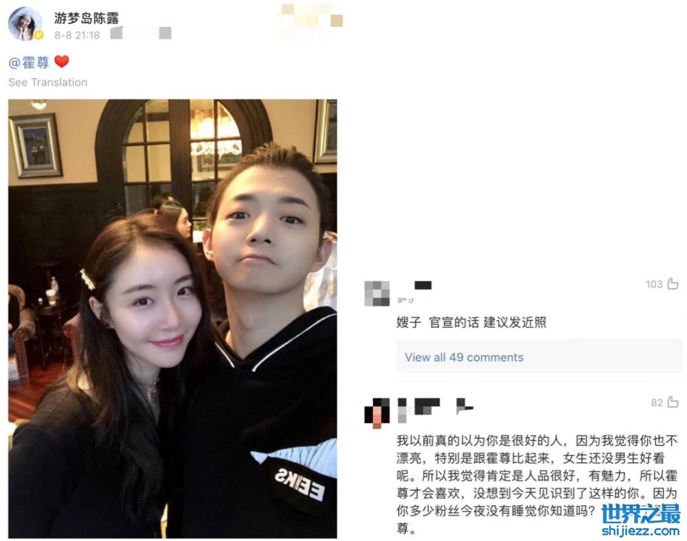 前几日,霍尊的圈外女友陈露发布了自己和霍尊的合照,进行单方面官宣。但是霍尊这一边并没有给出回应,许多网友在评论下面嘲讽陈露,称其单方面宣布恋情十分尴尬等不好的言论。