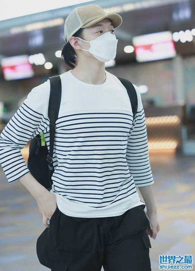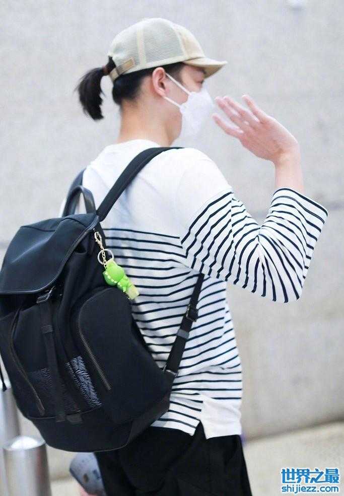 照片中,霍尊身穿黑白条纹长袖上衣配上黑色短裤,手腕十分纤细,他戴着一个米白色的鸭舌帽,还背了一个黑色的背包,上面还挂着一个绿色的小挂件,十分可爱,他还戴着一个白色的口罩,只露出一双眼睛,看起来有点疲惫。