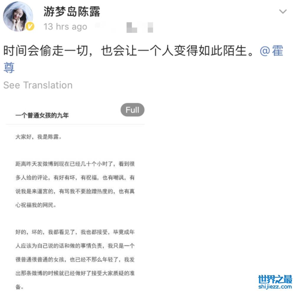 之后,陈露在社交平台上发长文,讲述了自己和霍尊的恋情事件原委,称霍尊欺骗自己的感情,甚至威胁自己删除相关言论。
