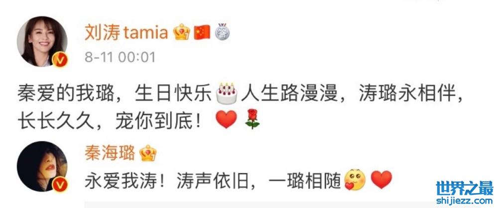 刘涛配文道:“人生路漫漫,涛璐永相伴”,秦海璐则在底下评论回复到:“涛声依旧,一璐相随”。