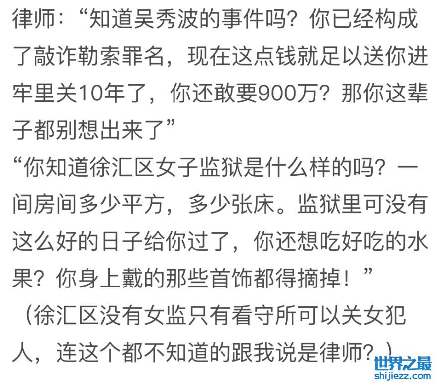 当陈露到了之后,现场除了霍尊好友和好友妻子,还有一名自称律师的人,三个人轮番对陈露进行威胁恐吓。自称律师的人以吴秀波事件为例子,恐吓陈露已经犯了敲诈勒索罪,足以让她在牢里关10年,并说她还敢要900万的话,这辈子都别想出来了。他们还给陈露描述徐汇区女子监狱的情况,说监狱里可没有好日子。