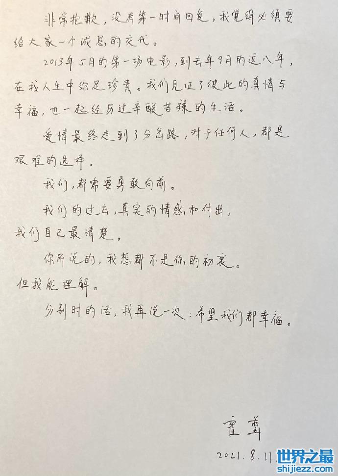他是这么说的:爱情最终走到了分岔路,对于任何人来讲都是一种艰难的选择。我们都要勇敢的向前,我们的过去,真实的感情付出,我们最清楚。