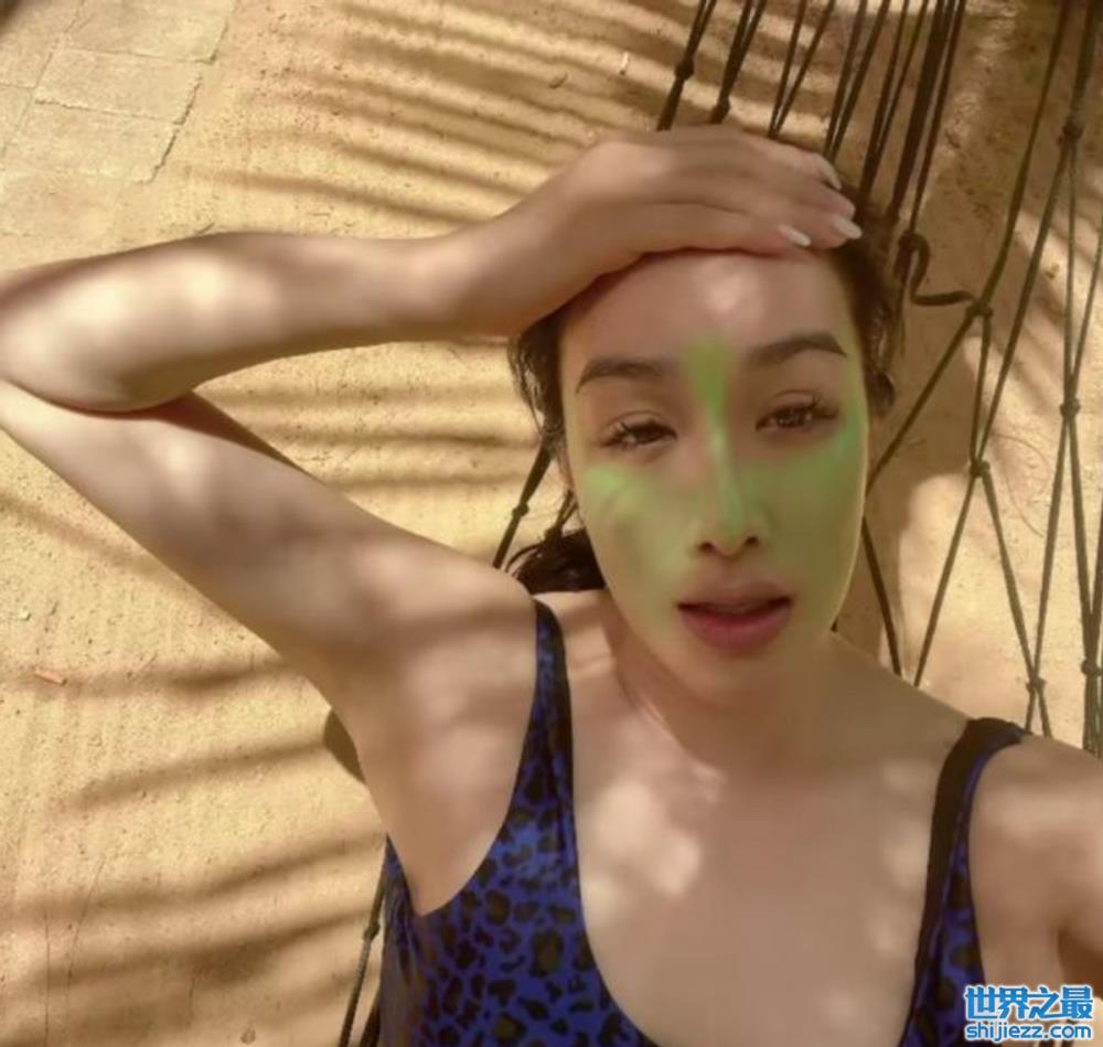 钟丽缇穿豹纹泳衣自拍!脸涂绿色面膜睫毛浓密,肩膀宽厚皮肤白皙 ...