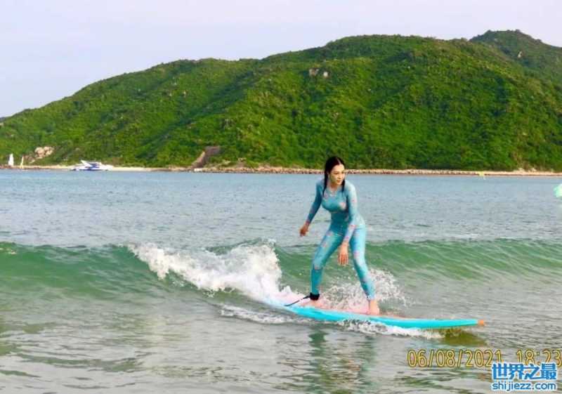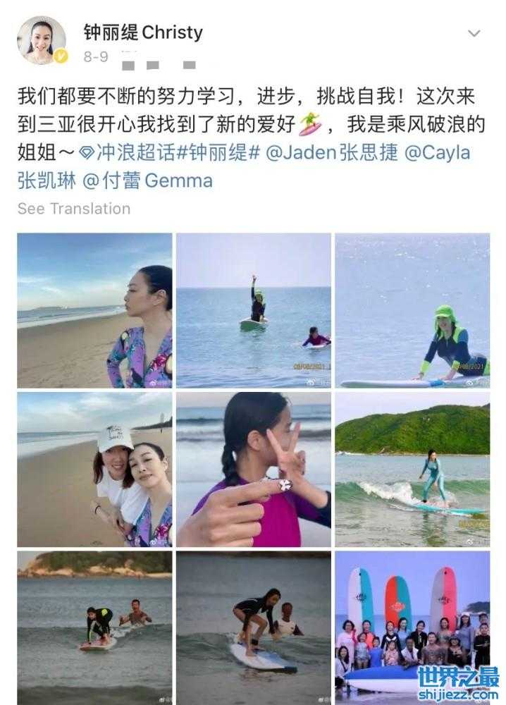 照片中,钟丽缇身穿蓝色碎花冲浪服,绑着两个麻花辫,一条腿和蓝橙色的冲浪板固定在一起,正在海上进行冲浪,她的姿势非常标准,应该是常年运动的缘故,很快就掌握了要领。