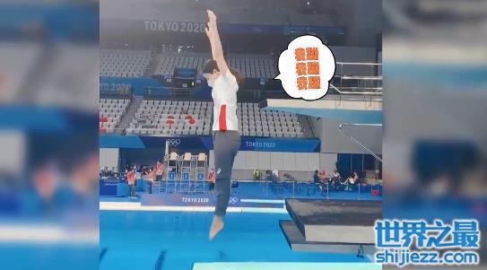 郭晶晶结束评委工作后,穿着一套运动服,罕见站上了10米高的跳水台,有模有样身姿舒展跳了几下后。结果回过头立刻变怂,弓着背连连摆手,说自己不敢挑战10米。