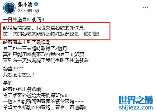 这也有了文章开头的那一幕,张本渝变身外卖员,亲自送外卖。