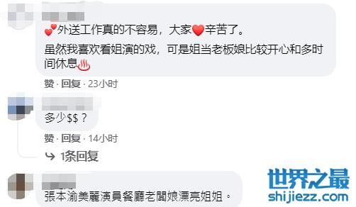 动态发布后,引起了许多网友的留言。有人表示理解外卖员的辛苦,有人称赞张本渝是美丽的演员,漂亮的餐厅老板娘。