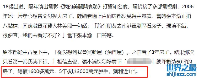 为了工作赚钱养父母,张本渝也十分努力。她在拍戏之余尝试过投资过房产,赚了约300多万人民币。
