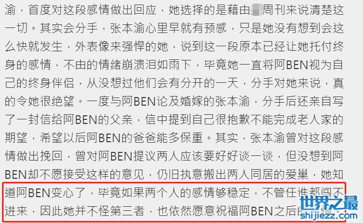 不料在2008年,他们传出了分手的消息,阿Ben否认是第三者插足,只说是感情变淡。而张本渝却在采访中暗示了第三者的存在,认为是阿Ben变了心。