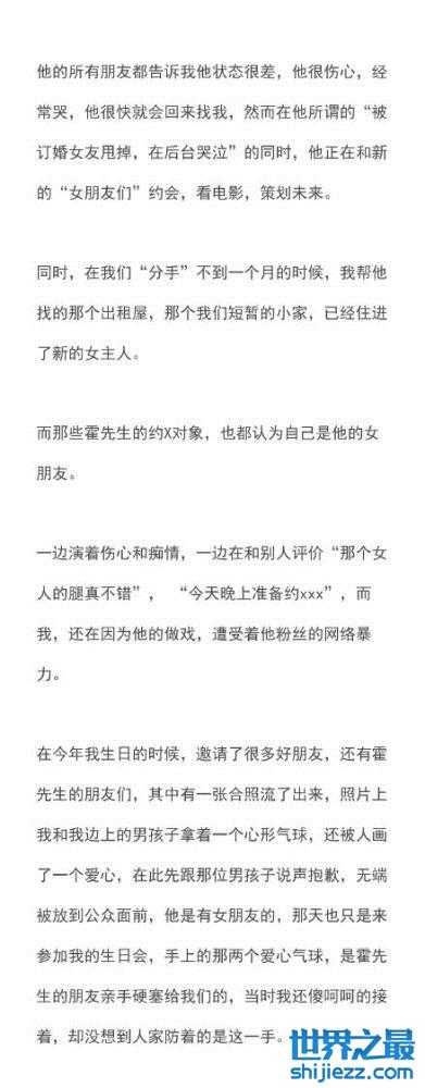 两天后,她在粉丝不断质疑、霍尊无回应的情况下,选择了发出长文说出真相。也意味着,做完最后的挣扎,最终站在了对立面,控诉这段坚持了9年之久的感情。