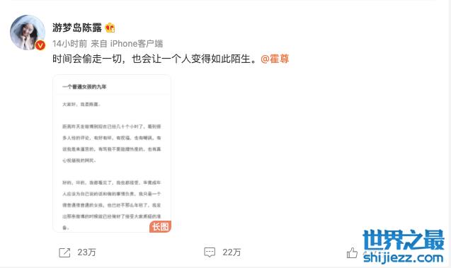 看到这里,如果陈露确实手里有实锤,那么霍尊的人设就彻底地崩了。这已经不再单单是两人感情问题,而是未分手期间——和多名女性约炮、诬陷炒作。