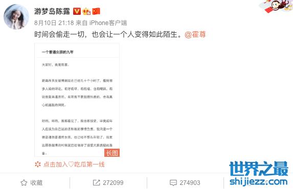 8月10日晚上,陈露在她前一天发合照时的同一时间发了长文,指控霍尊罔顾九年感情,劈腿多人。