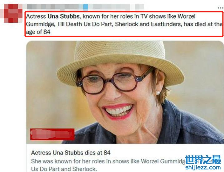 近日,据外媒报道,曾因出演《神探夏洛克》而闻名的女演员尤娜·斯塔布斯因病去世,享年84岁。