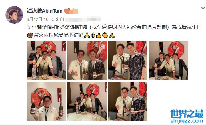 8.12日,谭咏麟在社交平台晒出一组合影,并配文称干儿子关楚耀和他爸爸关维麟为我庆祝生日。