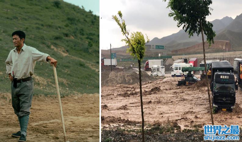 照片中吴京身穿米白色衬衫,搭配灰色工装裤,小腿上缠着很多脚带,脚上踩着老布鞋。他的衣服袖口卷着内衬疑似有点脏,裤子膝盖处上沾上了很多黄土,布鞋底下的边边泛黄,因为前两天片场遭遇了山洪。