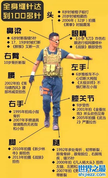 其次,吴京也很敬业,无论戏份是否危险都会坚持自己亲自上场,绝不用替身。很多打戏的动作他坚持必须真打,经常因为不当动作多次受伤。有网友统计吴京因为拍戏全身缝针现在达到100多针。
