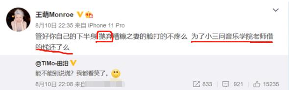 作为陈露的好友,个人社交媒体账号昵称为“王萌Monroe”的人直接留言怒怼田汨,直接就放锤猛锤了田汨,原来这位田汨自己也不太光彩,疑似婚内出轨最终把自己的妻子抛弃,还为了小三跟同事借钱。
