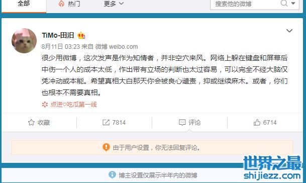 在这之后田汨的做法也非常耐人寻味,田汨将自己用于发生的社交媒体账号设置成了仅半年可见,而且删除了之前对陈露发文回应的那条内容,现在的账号里只剩下一条内容,而且还对评论进行了设置。