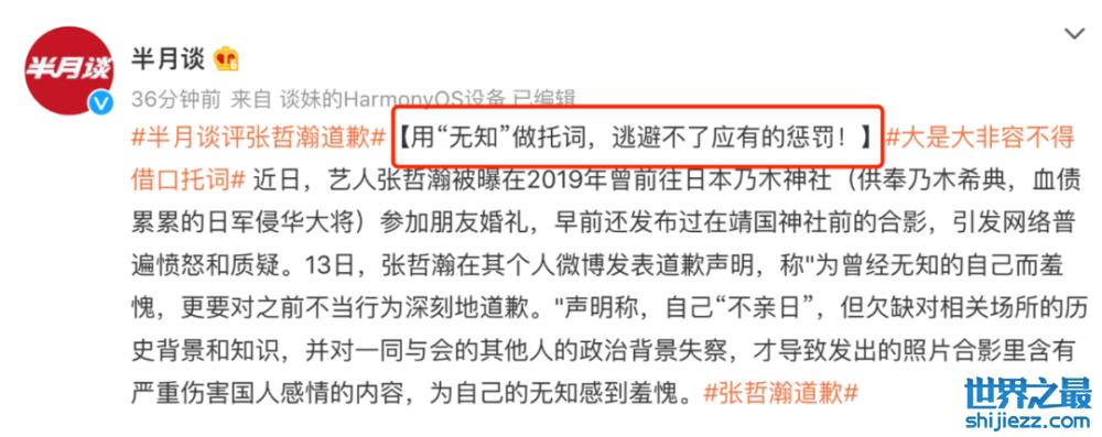 在网友指责张哲瀚去日本神社参加婚礼、罔顾历史跑到JG神社门口开心拍照后,他本人发布了一篇道歉信。