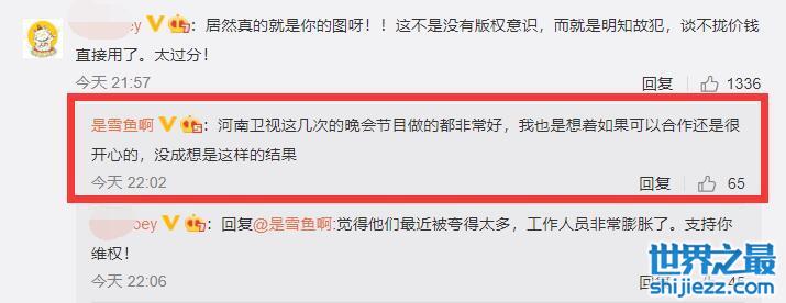 于是就出现了双方明明合作谈崩的情况下,河南卫视没经过原作者同意,用了图,也就算是盗图。该作者还在评论区补充说:“河南卫视这几次的晚会节目做的都非常好,我也是想着如果可以合作还是很开心的,没成想是这样的结果”。